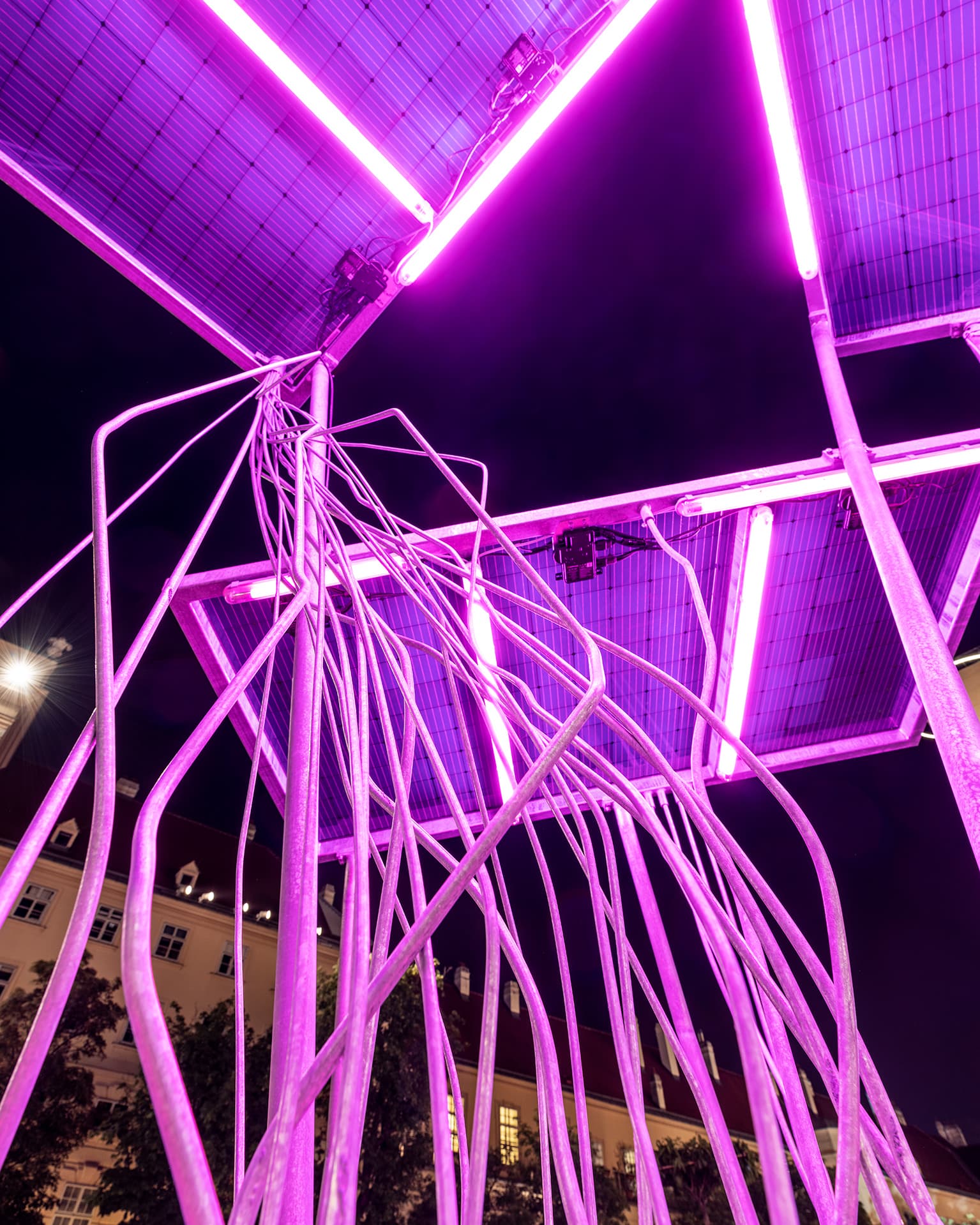 Judith Fegerl has been artistically dealing with energy as a medium and material for many years. Her new work of art "converter" is a hybrid structure made of steel, photovoltaic panels, light and electronic components that "feeds" on sunlight. The three sculptures have formal and thematic references to technical objects, architectural forms as well as to the flora and fauna; they seem strange and familiar at the same time. The overall appearance is reminiscent of a hybrid of machine and organism, seems archaic and futuristic at the same time.While the photovoltaic panels convert solar energy into electrical energy during the day, which is fed into the power grid, the sculpture provides shade for visitors: inside. At night, the production ratio is reversed and the sculpture becomes a consumer of the solar energy previously fed in: it emits intense violet light."converter" deals with the ecological, cultural, aesthetic and systemic aspects of the use of photovoltaics and negotiates the relationship between nature and technology as well as the effects and benefits of technological developments.